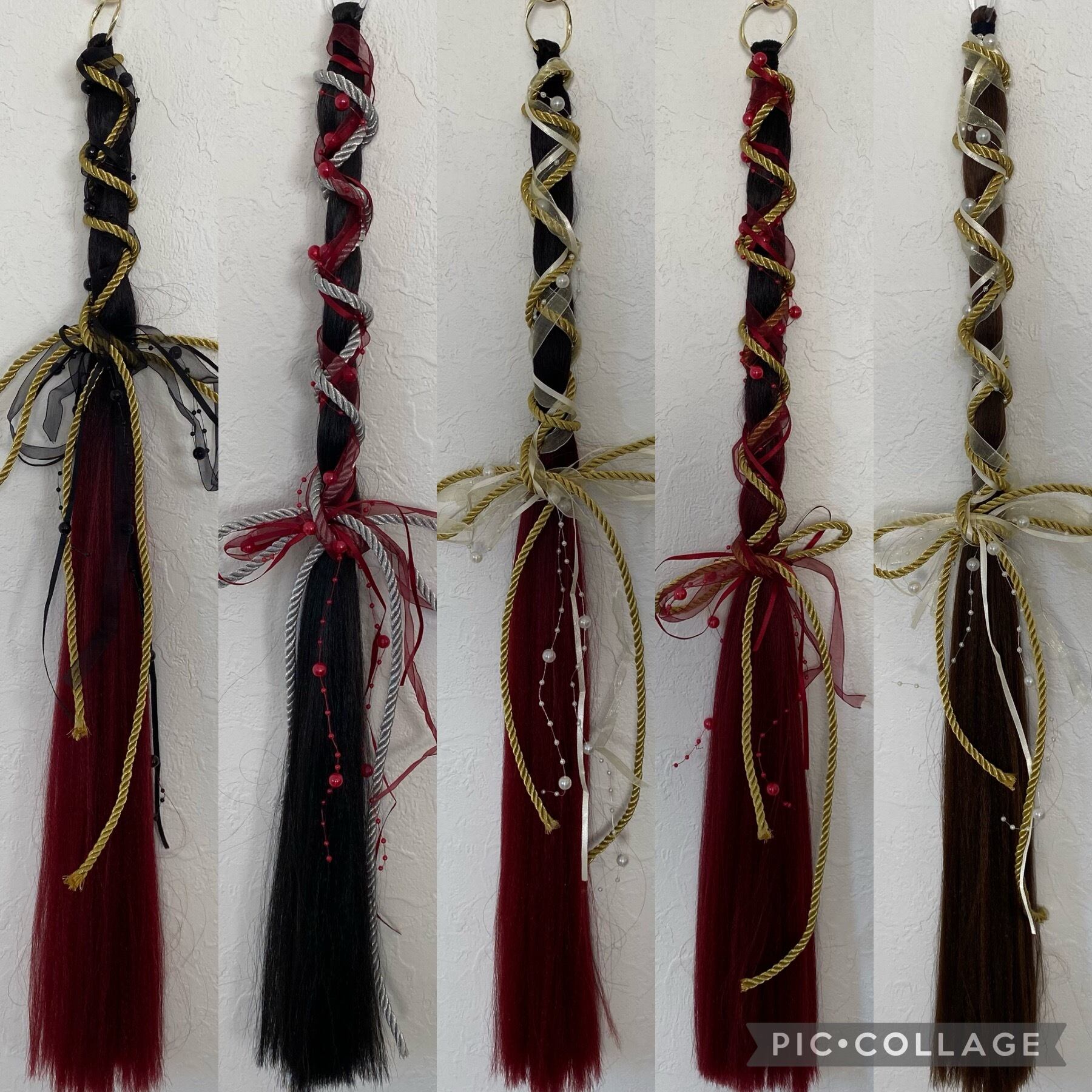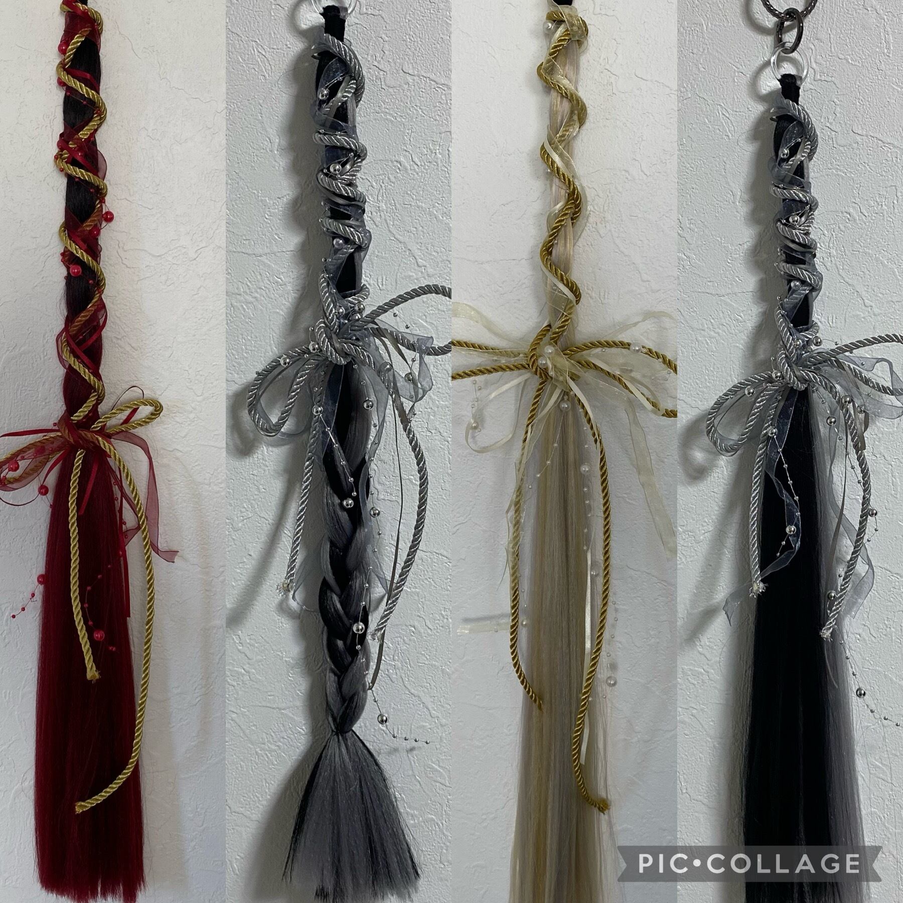 数枚お見本を載せていますが、お届けはツイストロープ、パールチェーンリボン 共に丸めた状態でのお届けとなりますので、お客様でアレンジして装着してください。(本体のエクステは別売りとなっております)